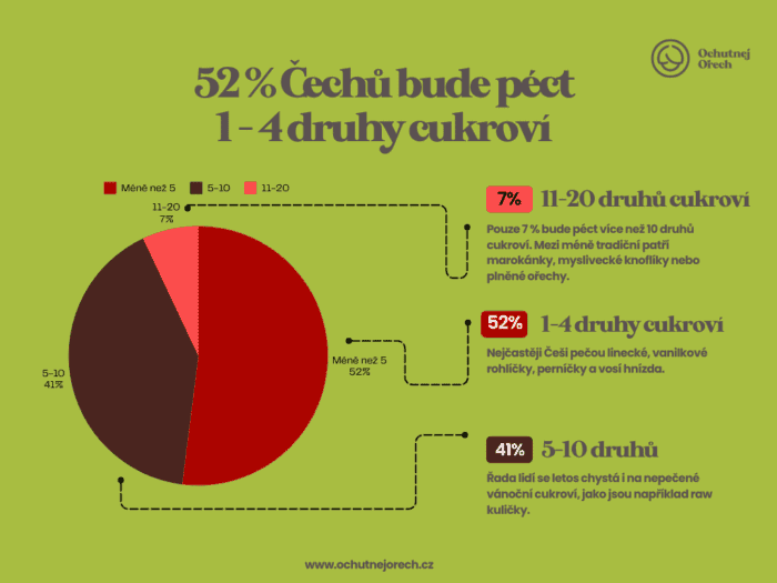 Praha, 16. decembra 2024 — Česi tento rok plánujú piecť menej druhov vianočného pečiva, než boli zvyknutí v minulých rokoch. Dôvodom sú rastúce ceny orechov a ich zlá dostupnosť. Podľa prieskumu spoločnosti Ochutnej Ořech, ktorá oslovila 80 tisíc svojich zákazníkov, plánuje 52 % domácností piecť menej ako päť druhov pečiva, 41 % šesť až desať druhov a len 7 % sa pustí do viac ako desiatich druhov. „Celkom 38 % ľudí uviedlo, že tento rok upečie menej pečiva než vlani, zatiaľ čo 56 % zachová rovnaký počet a len 6 % z nich plánuje piecť viac,“ uvádza Petr Voves, generálny riaditeľ e-shopu Ochutnej Ořech.