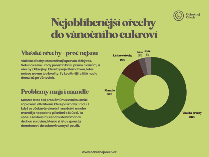 Výsledky prieskumu naznačujú, že rastúce ceny orechov sú jedným z hlavných dôvodov, prečo Česi tento rok plánujú menej piecť. „Vlašské orechy, ktoré pri pečení používa 66 % domácností, sú tento rok výrazne drahšie a horšie dostupné. Vlašských orechov z českej produkcie je nedostatok, pretože pomrzli. Orechy z Ukrajiny majú nižšiu kvalitu. Navyše dodávky z USA, ktoré obvykle zabezpečujú vyššiu kvalitu, dorazia na európsky trh až začiatkom roku 2025,“ vysvetľuje Voves.