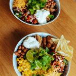 Do misky vložte ryžu a pridajte fazuľu, nachos lupienky, kukuricu, čedar, avokádo a vegánske mäso.